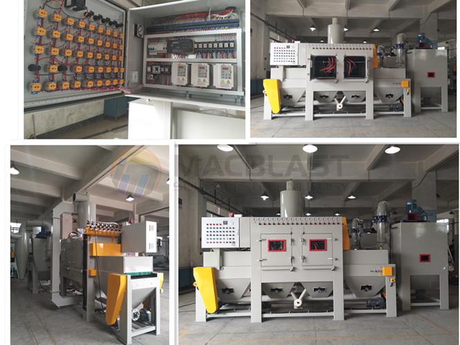 Our conveyor belt automatic sandblasting machine is designed and developed for flat products like steel sheet, mobile telephone shell, TV frame, cake pan, kitchen ware, cookware, cooking utensil, utensil rack,etc. It is a versatile, can cater to a wide array of small to mid-size of flat products.