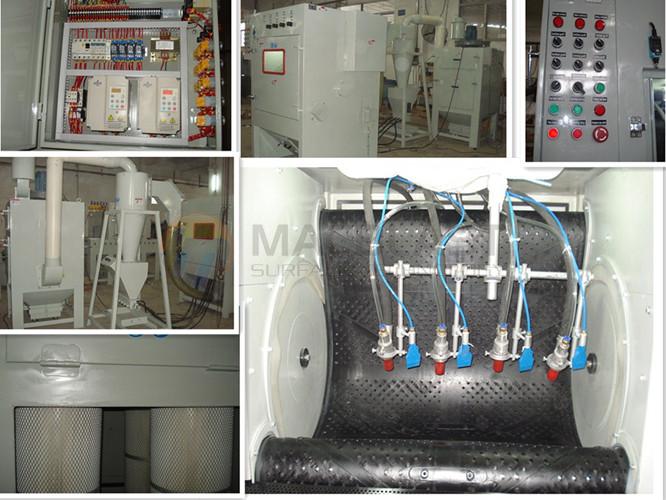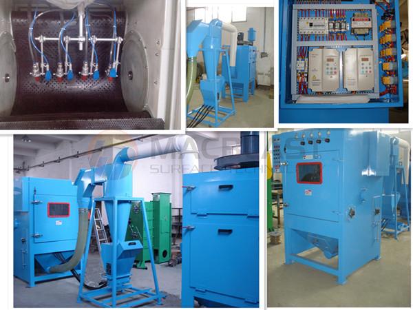 This TUMBLE BLAST mac1212-4 is built for our customers who need efficient, reliable and high production blasting, it is maximum 6pcs mac B type sandblasting guns with oscillating gun mount system to ensure maximum coverage.The cabinet can work with most common recyclable abrasive medias, can deliver affordable, batch processing to clean, peen, deburr or finish parts.